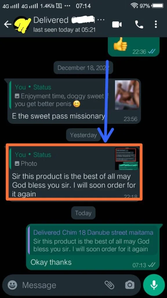 "This product surprised me wallahi!!! I didn’t expect much at first because I have used many fake products, but this one is original and confirm. In fact, the difference is clear. I feel high urge, last long in the bedroom. My wife even asked me what changed and I just laughed."